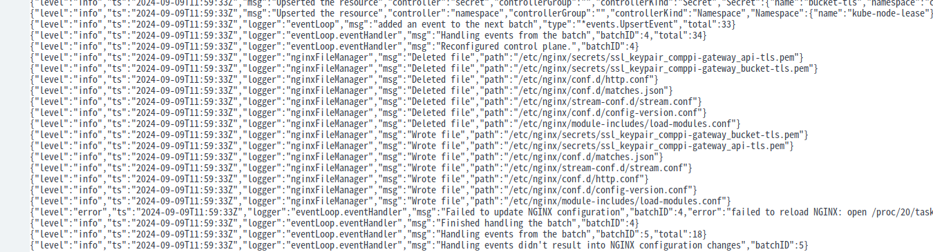 nginx-gateway 는 처음 로드되면 클러스터에 있는 모든 Service, Endpoint, Secret 등 트래픽 라우팅에 필요한 클러스터 서비스 정보들을 읽어들이기 시작한다. 그러면서 해당 정보에 맞추어 실제 워크로드인 nginx 파드의 설정을 조정하여 원하는 상태로 동기화 시켜준다. (Upserted the resource 로그와 Reconciling the resource 로그가 반복적으로 찍힌다.) 라우팅 구성을 담고있는 HTTPRoute 도 전부 읽어들인다. 간간히 Nginx 설정 정보를 담고 있는 여러 conf 파일들의 갱신 로그가 뜨는데, 내가 설정해준 ssl 인증서도 갱신되는 것을 볼 수 있다.