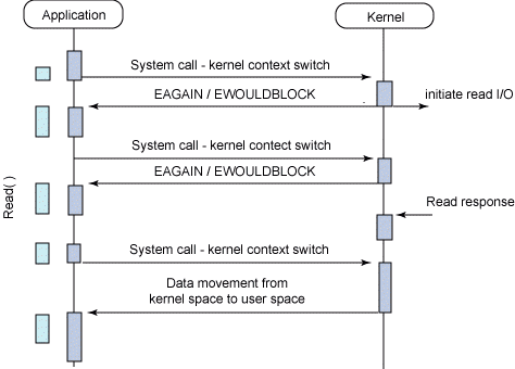 반대로 Non-blocking I/O 도 생각할 수 있다. 스레드가 운영체제에 accept() 같은 메서드를 통해 시스템 콜을 보냈을 때, 만약 커널에서 요청이 준비되지 않은 경우 이를 그대로 반환하여 스레드가 지속적으로 작업을 수행 할 수 있게 하는 것이다. 하지만 디스크 I/O 에서 인터럽트를 통해 운영체제에게 I/O 가 준비되었다고 알려주는 것과는 다르게 이 경우에는 스레드에서 주기적으로 폴링을 하여 I/O 작업을 시작할 수 있는 지를 확인해야 한다.